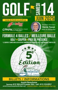 olf aura lieu au golf de Montpellier le samedi 14 juin 2025. Le souper et soirée se fera au 17, rue Principal, Montpellier situé au Centre communautaire. Pour plus d’information contacter Annick Beauchamp: 819-983-6373 poste 226 ou 819-210-0957.